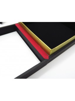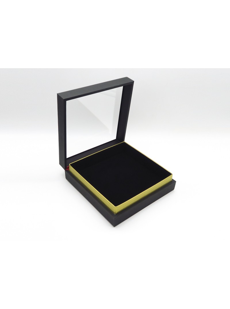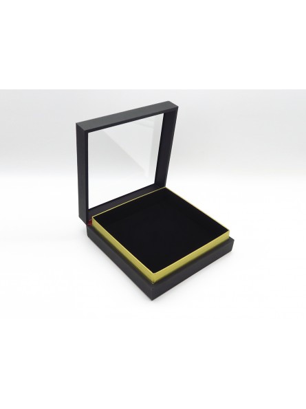 Ce modèle rectangulaire est en bois recouvert de papier noir mat. Il a un dessus vitré et une charnière.