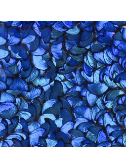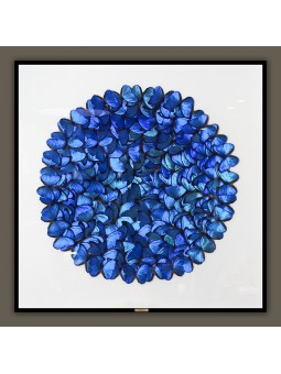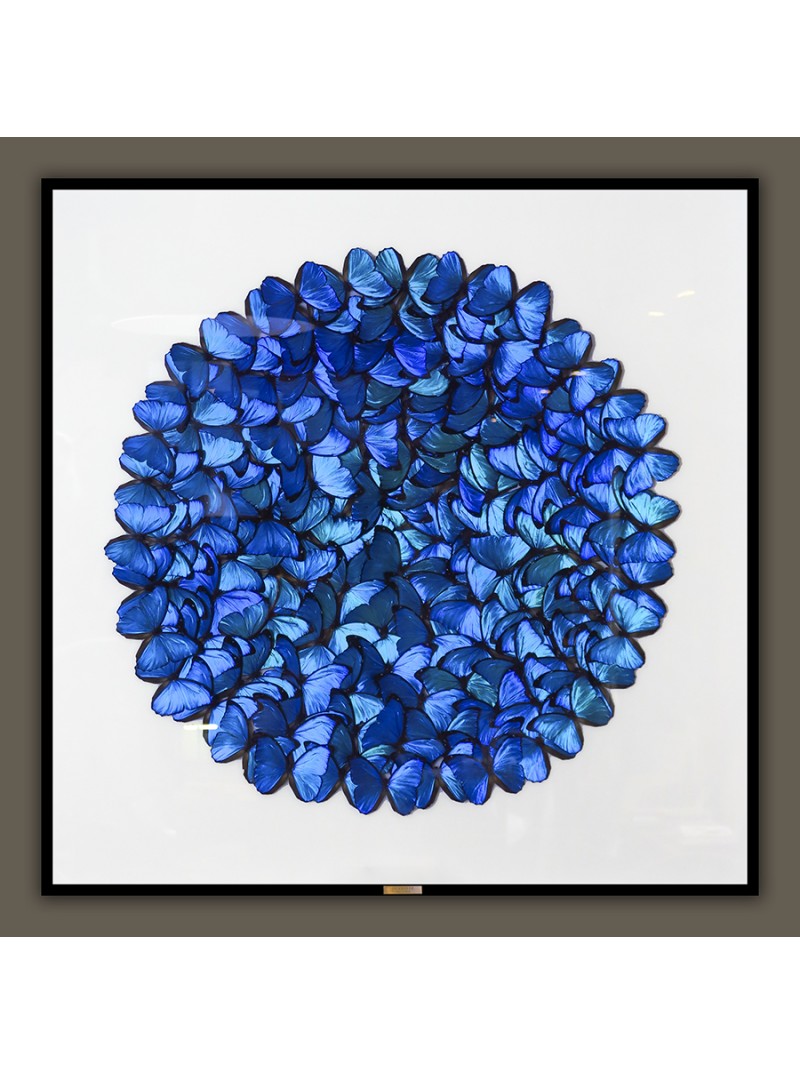Composition audacieuse à la puissance esthétique saisissante, ce nuage de morpho menelaus offre au regard l'une des couleurs les plus intenses et surprenantes du règne animal. Le bleu profond aux reflets métalliques qui caractérise cette espèce de papillon se concentre dans le foisonnement maîtrisé d'un grand cercle réunissant plusieurs dizaines de spécimens. Hautement décorative, cette vitrine aux dimensions remarquables trouve de surcroit sa place parmi les plus belles pièces de curiosités entomologiques, invitant au rêve et à la contemplation par l'observation de la nature.