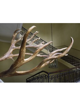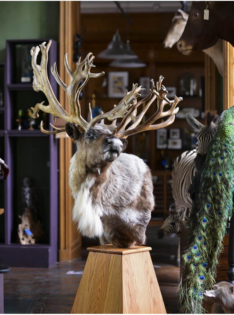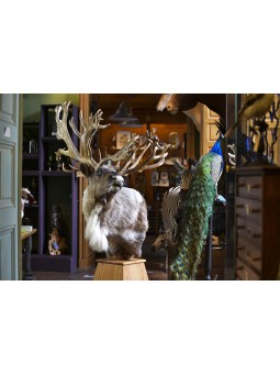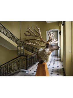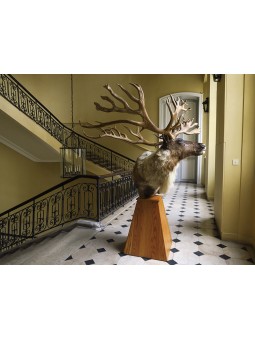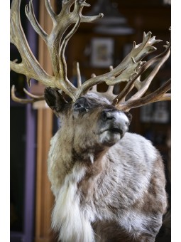 L'extraordinaire ramure de ce caribou canadien, sa couronne de bois, impressionne et force le respect par sa taille (plus d'1.40 m !) et son élégance rare. Son regard vivant, sa posture énergique, signent là une grande maîtrise de la taxidermie et incontestablement une pièce d'exception.