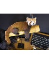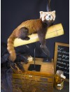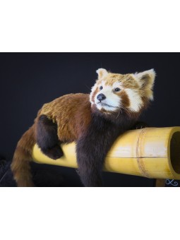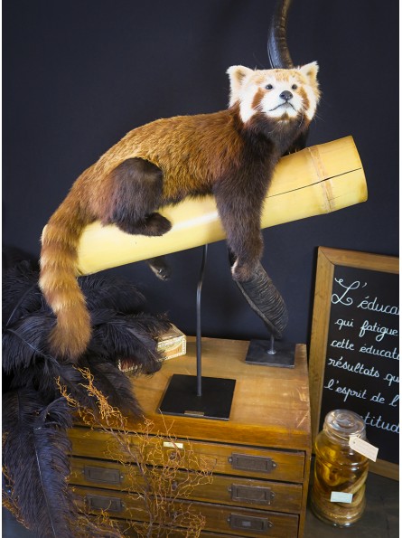 Particulièrement attendrissant avec sa fourrure brune et feu, sa queue hirsute et son masque blanc, notre panda roux se repose nonchalant sur un large bambou d'où il tire le principal de son alimentation. Présenté sur un socle en métal noir dans un style muséal sobre et contemporain, ce spécimen d'une grande rareté est offert à la vente accompagné de tous ses documents CITES.