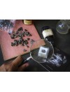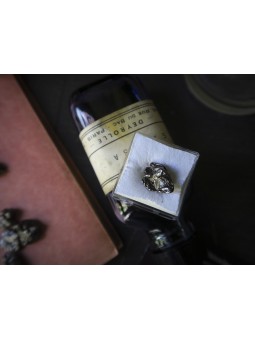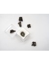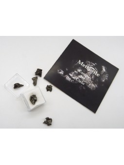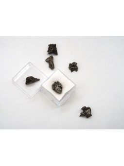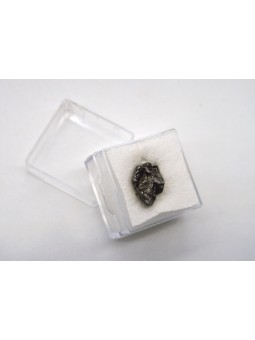 Fragment de météorite Campo del Cielo d'environs 10 mm, présentée dans une petite boîte transparente.