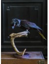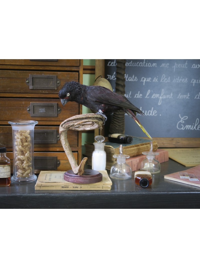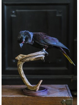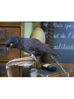 Magnifique dans sa livrée noire aux reflets pourpres, ce rare spécimen de Chalcopsittaatra estnaturalisé sur une branche élégamment courbée.