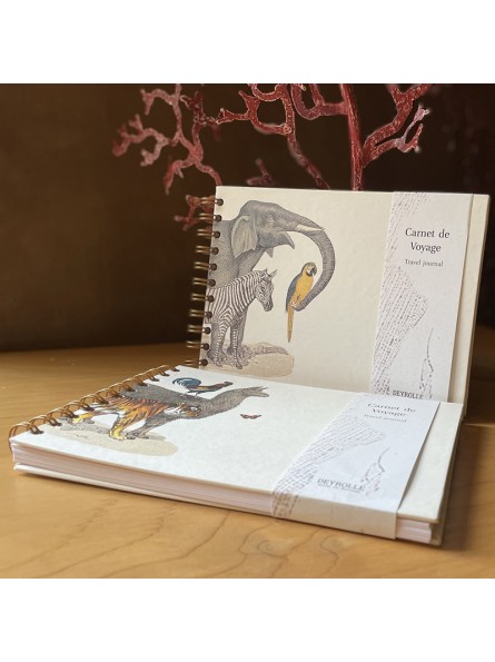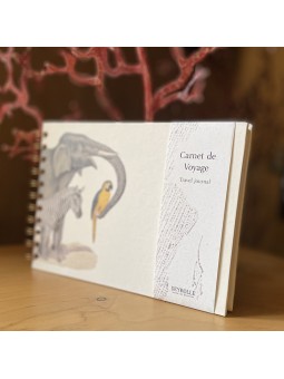 Carnet de voyage format A5 paysage. Couverture en papier Maya ivoire teinté dans la masse et résistant à la lumière. Feuillets de papier Clairefontaine vélin velouté blanc 90g, certifié PEFC et fabriqué dans les Vosges par Clairefontaine.