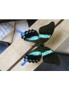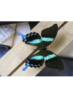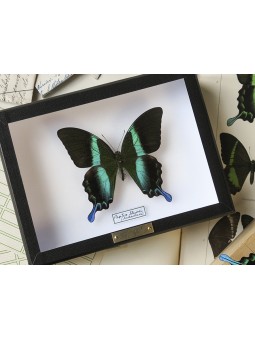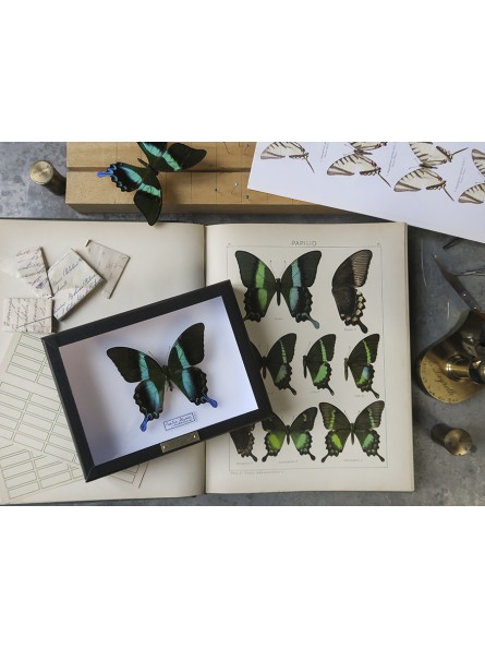 Membre de la famille des Papilionidae, le Papilio blumei et la large raie vert turquoise qui traverse chacune de ses ailes surprend. Présenté dans une boîte entomologique fabriquée de manière artisanale dans un atelier français et dont le cadre en cartonnage est recouvert de papier noir mat, il pourra facilement être accroché au mur grâce à deux anneaux situés au dos de la boîte.