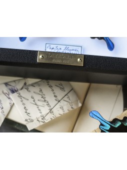 Une étiquette calligraphiée indiquant le nom latin et l'aire de répartition du papillon sera placée par nos ateliers sous celui-ci et la plaque en laiton gravée du nom de Deyrolle - garantissant que votre spécimen est issu de nos collections - viendra parfaire l'ensemble.