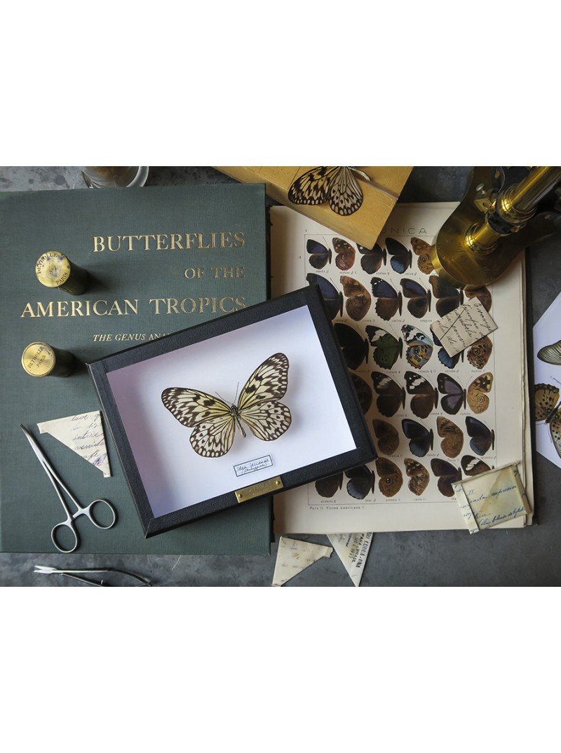 Élégant et délicat, Idea leuconoe est un grand papillon de la famille des Nymphalidae dont les ailes aux formes douces suivent un motif subtil. Présenté dans une boîte entomologique fabriquée de manière artisanale dans un atelier français et dont le cadre en cartonnage est recouvert de papier noir mat, il pourra facilement être accroché au mur grâce à deux anneaux situés au dos de la boîte.