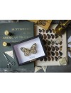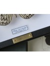 Une étiquette calligraphiée indiquant le nom latin et l'aire de répartition du papillon sera placée par nos ateliers sous celui-ci et la plaque en laiton gravée du nom de Deyrolle - garantissant que votre spécimen est issu de nos collections - viendra parfaire l'ensemble.
