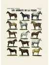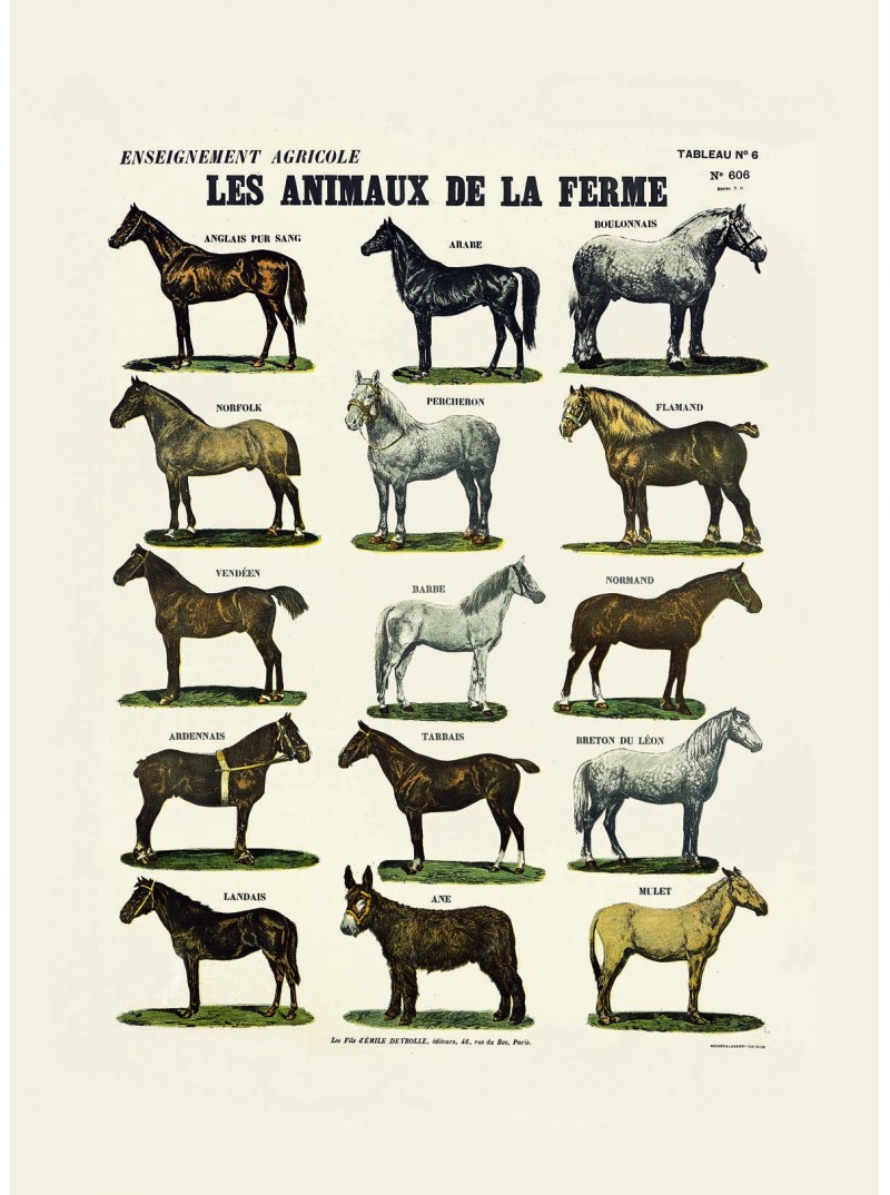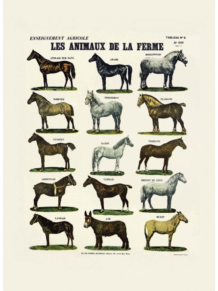 Planche n°606 : Les animaux de la ferme - Les chevaux. Réédition d'une planche ancienne Deyrolle.
