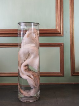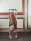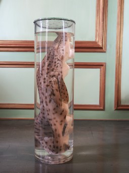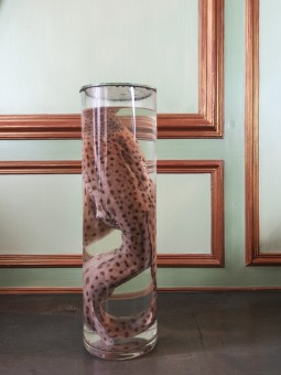 Présenté en fluide dans un long cylindre de verre, ce spécimen de grande roussette de Méditerranée aurait toute sa place entre les murs d'un musée. Reconnaissable à sa magnifique peau tachetée ainsi qu'à la forme effilée de son corps, ce petit requin familier des mers d'Europe est particulièrement beau et rarement présenté ainsi. Une très belle pièce de collection !