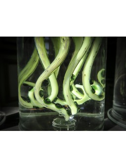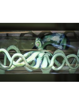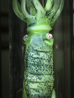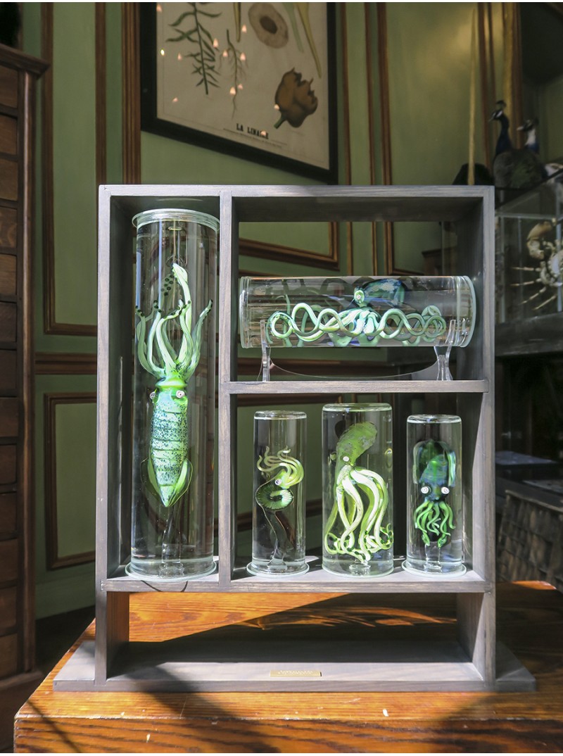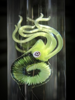 Réalisation par l'artiste verrier William Geffroy d'un cabinet de curiosités accueillant plusieurs spécimens de céphalopodes en verre.