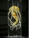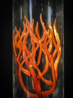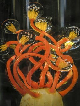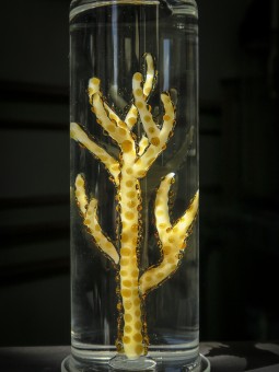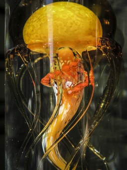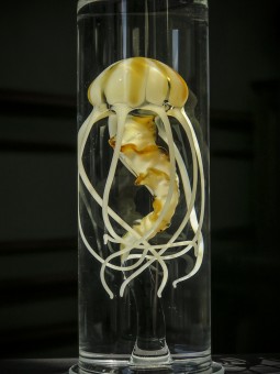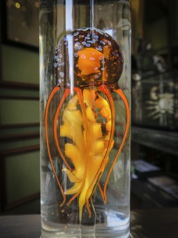 Réalisation par l'artiste verrier William Geffroy d'un cabinet de curiosités accueillant plusieurs spécimens de cnidaires en verre.