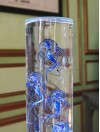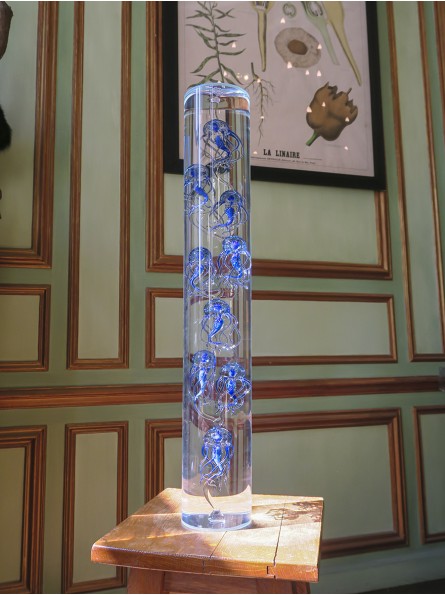 L'eau déminéralisée utilisée pour remplir le cylindre replace le rôle de la lumière et de la transparence au coeur du travail de l'artiste tout en mettant en valeur la délicatesse des formes et des couleurs des créatures de verres présentés.