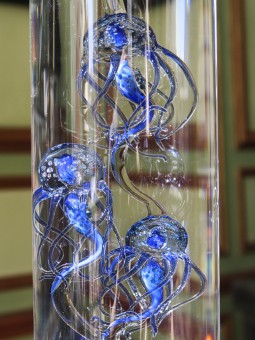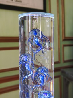 Réalisation par l'artiste verrier William Geffroy d'un banc de neufs superbes méduses dans un cylindre de verre.
